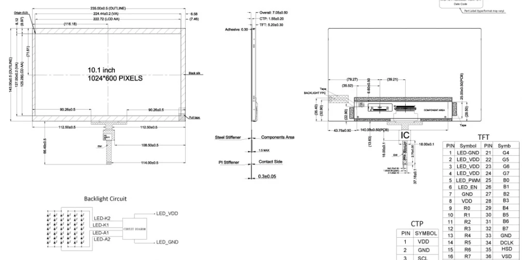Suas dimensões estreitas de apenas 235 mm × 143 mm × 7,05 mm o tornam adequado para dispositivos compactos. Alimentado por 3,3 V e usando um cabo FFC de 40 pinos (FFC de 6 pinos para CTP), o módulo de tela sensível ao toque PCAP industrial de 10,1 polegadas opera em temperaturas que variam de -20°C a 70°C e tem uma faixa de temperatura de armazenamento de -30°C a 80°C, garantindo uma operação confiável mesmo em ambientes agressivos.