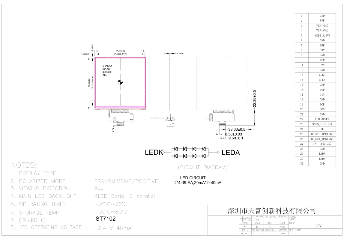 Este robusto módulo de tela sensível ao toque fina na célula de resolução personalizada 480×RGB×480 de 3,95 polegadas apresenta desempenho excepcional, operando de forma confiável mesmo em ambientes extremos com uma faixa de temperatura operacional garantida de -30°C a +80°C.